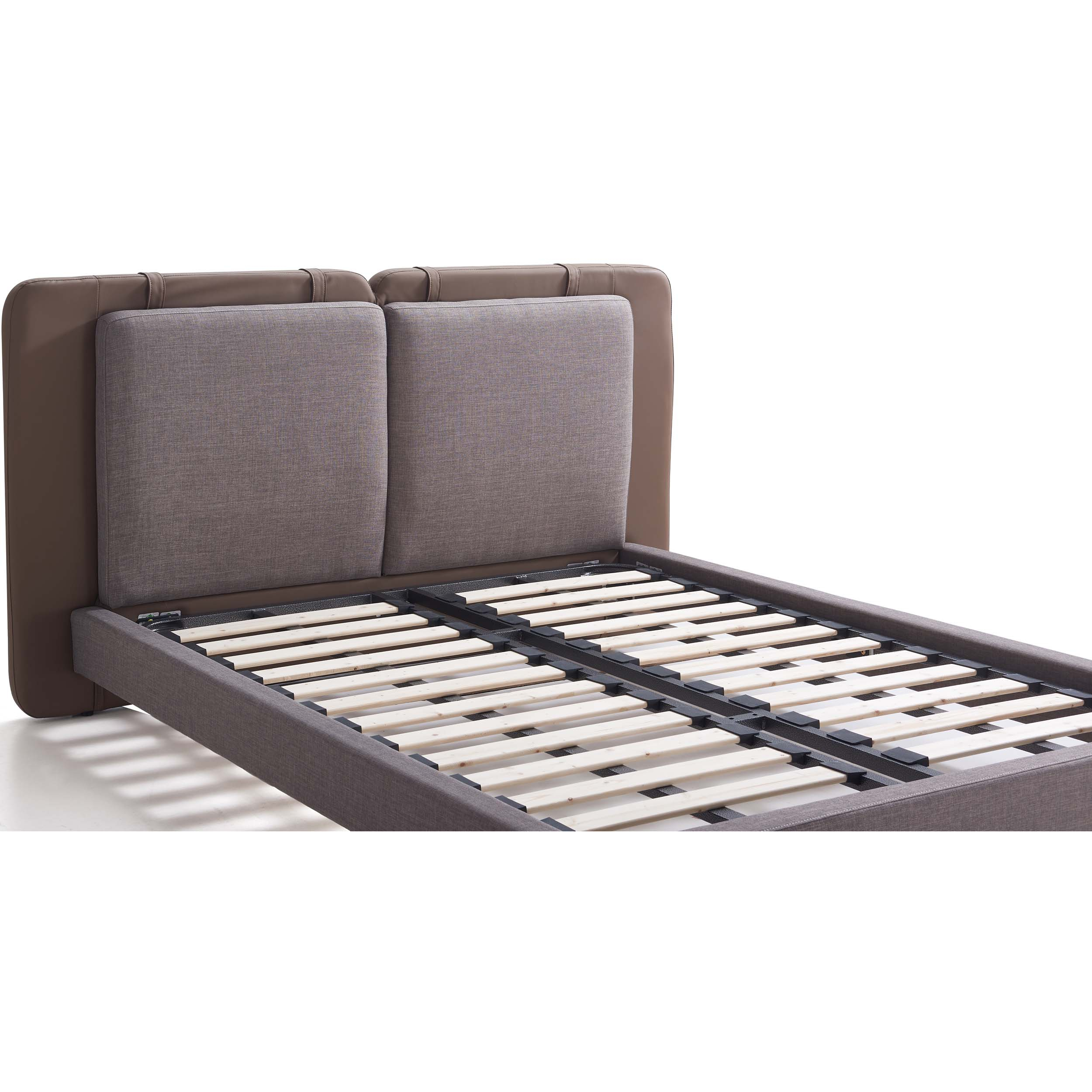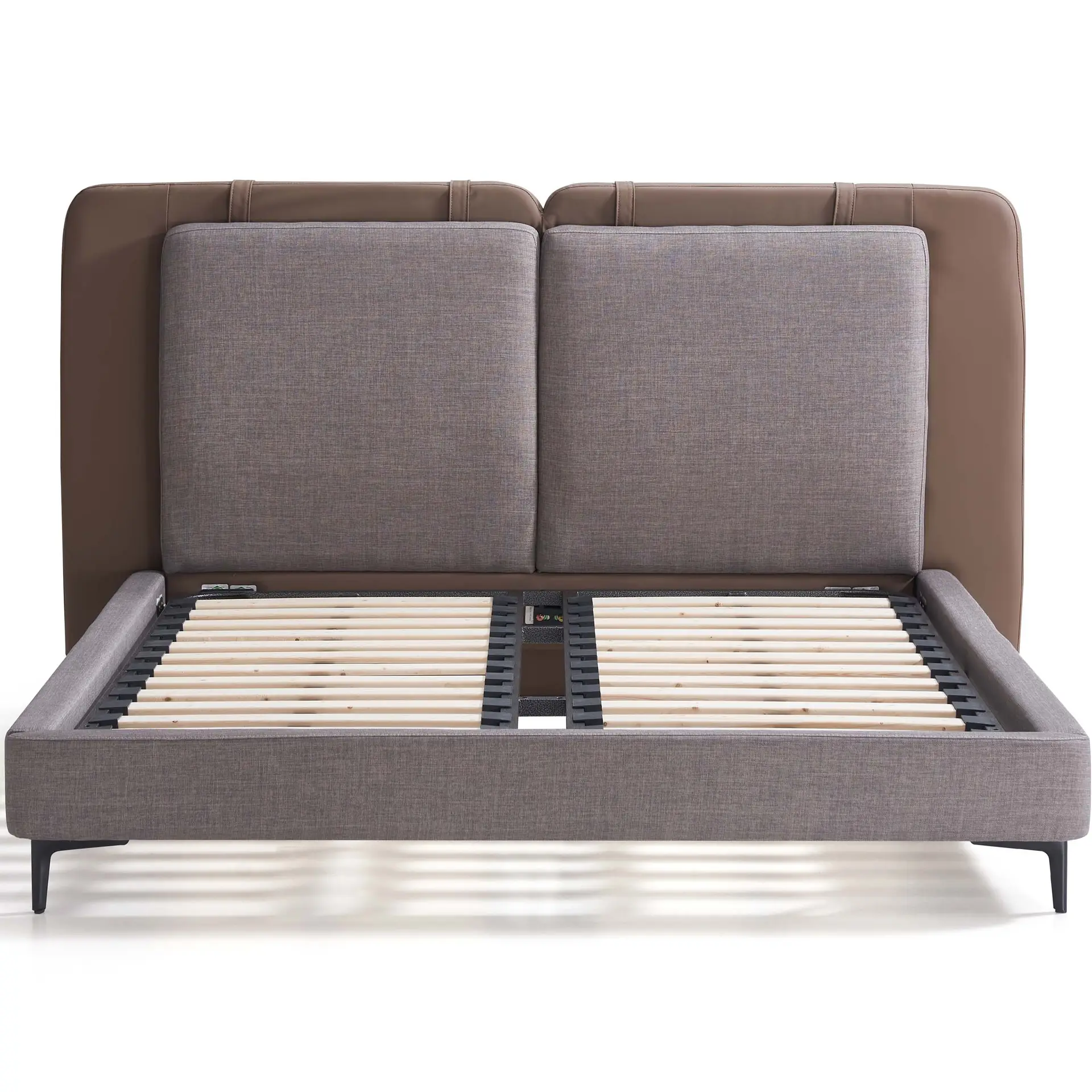 Add bold character and everyday comfort to your bedroom with the Adaliz Luxe Upholstered Bedframe. Featuring a sculpted double headboard—faux leather at the back and fabric-upholstered cushions at the front—this unique design offers plush support for reading, relaxing, or lounging in style.