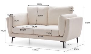 With a width of 170 cm, depth of 85 cm, and height of 97 cm, this sofa is thoughtfully sized for versatile placement without compromising seating space. The seat height is a comfortable 40 cm, while the backrest and armrest heights are 50 cm and 70 cm respectively. The 6-inch elevated legs not only lend a modern aesthetic but also make cleaning underneath easier.
