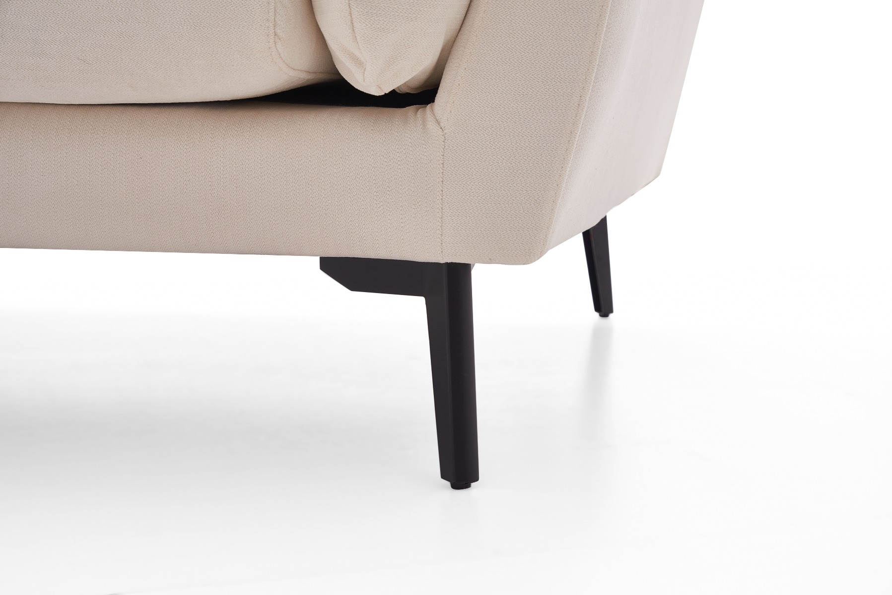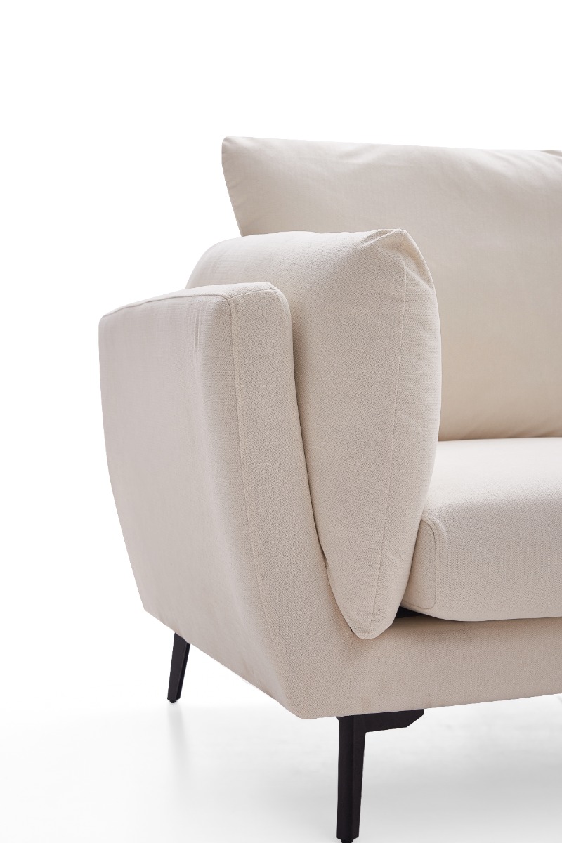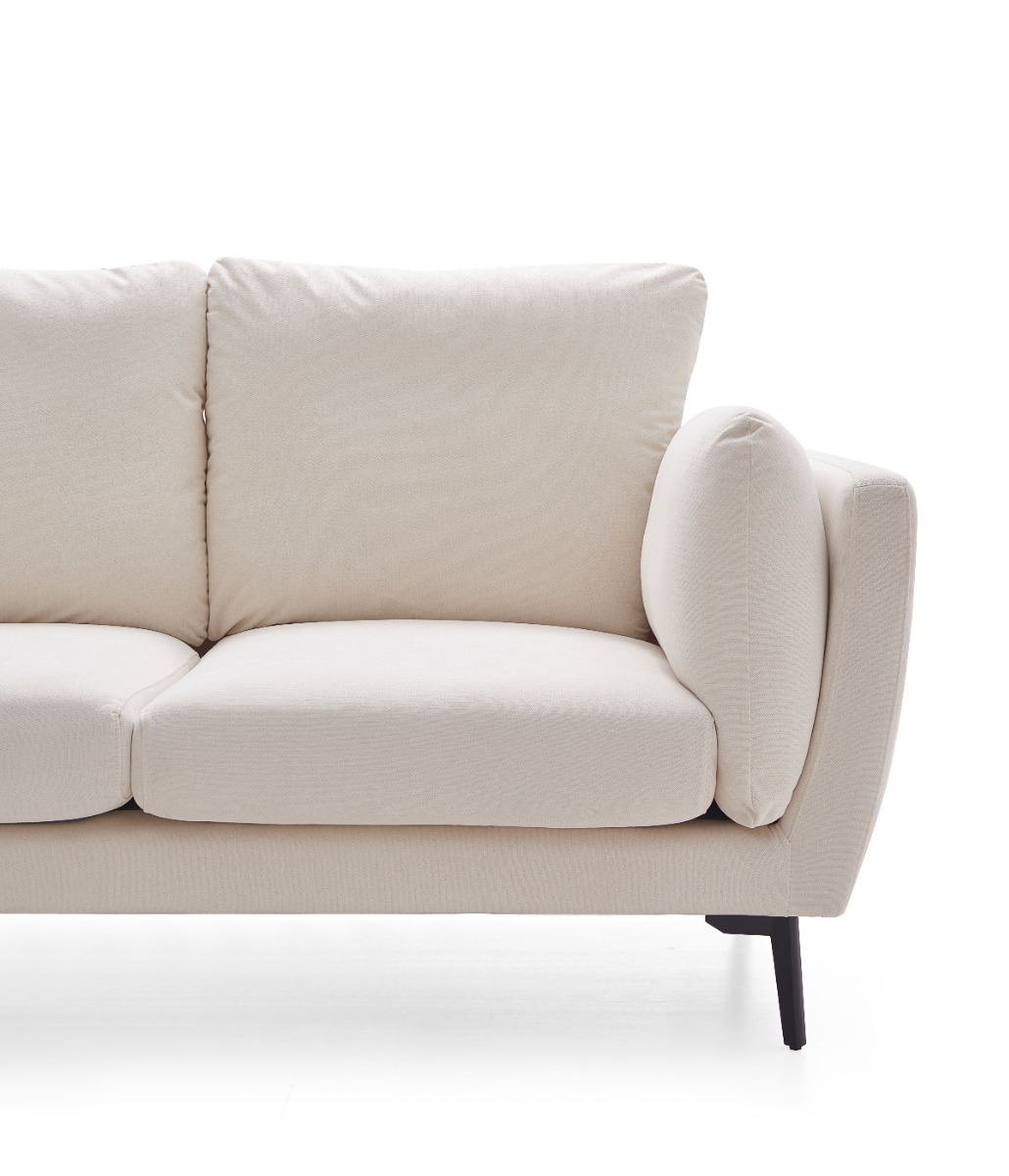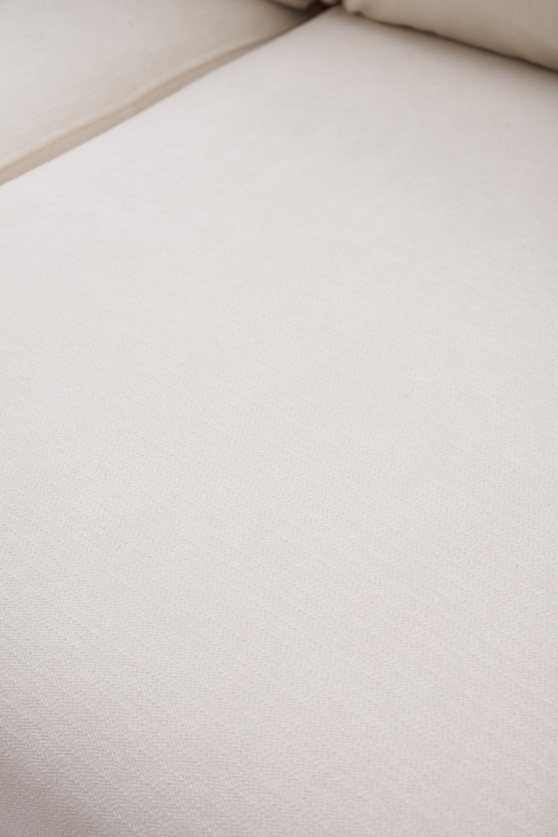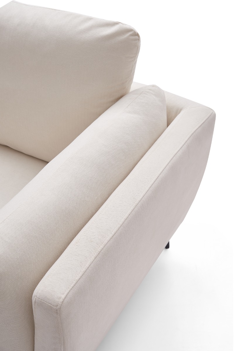Upholstered in high-quality white fabric, the sofa features medium-soft seat and backrest firmness (5/10) for a balanced level of support and comfort. The removable back and seat cushions are filled with polyurethane foam and pocketed springs, ensuring plush comfort with lasting resilience. A strong seat base is built with serpentine springs and elastic webbing for added durability.