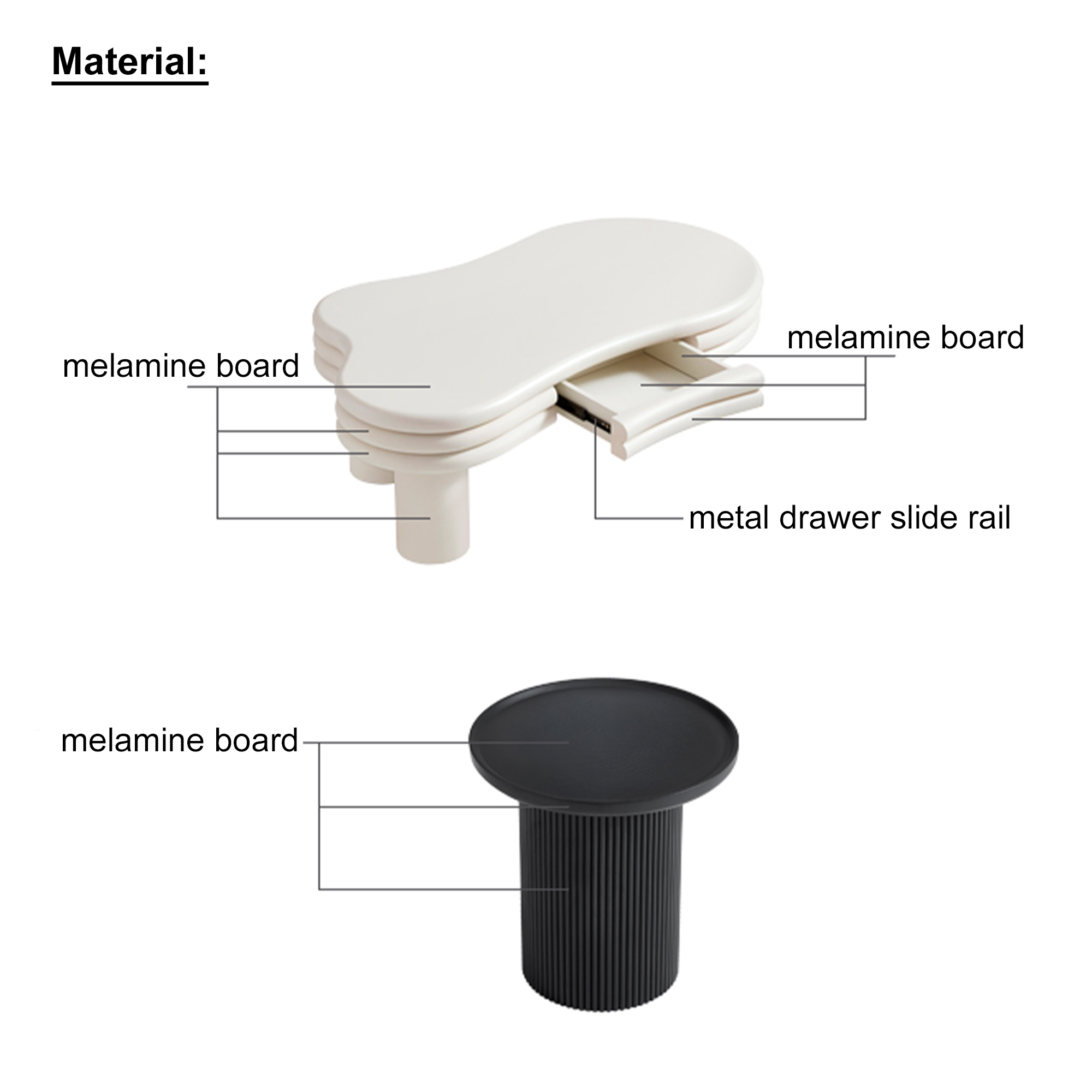 Crafted from durable melamine board, the tables feature sturdy cylindrical legs and smooth, rounded edges for added safety. The spacious tabletops are ideal for daily use—perfect for drinks, books, or décor. The built-in drawer offers convenient dust-free storage.
