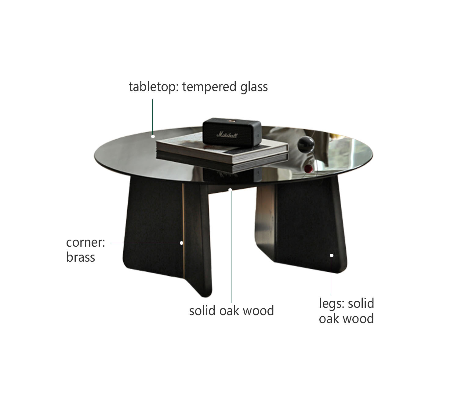 Its tempered glass top is durable, waterproof, and easy to clean, while the rounded edges and angled solid oak legs ensure both safety and stability. Brass details add a touch of elegance.