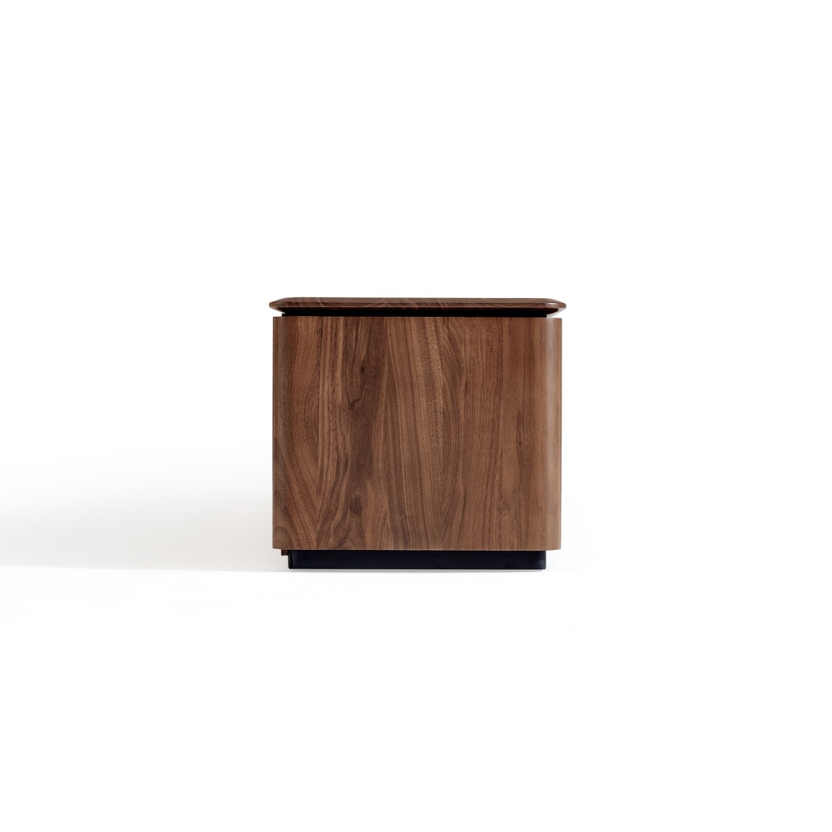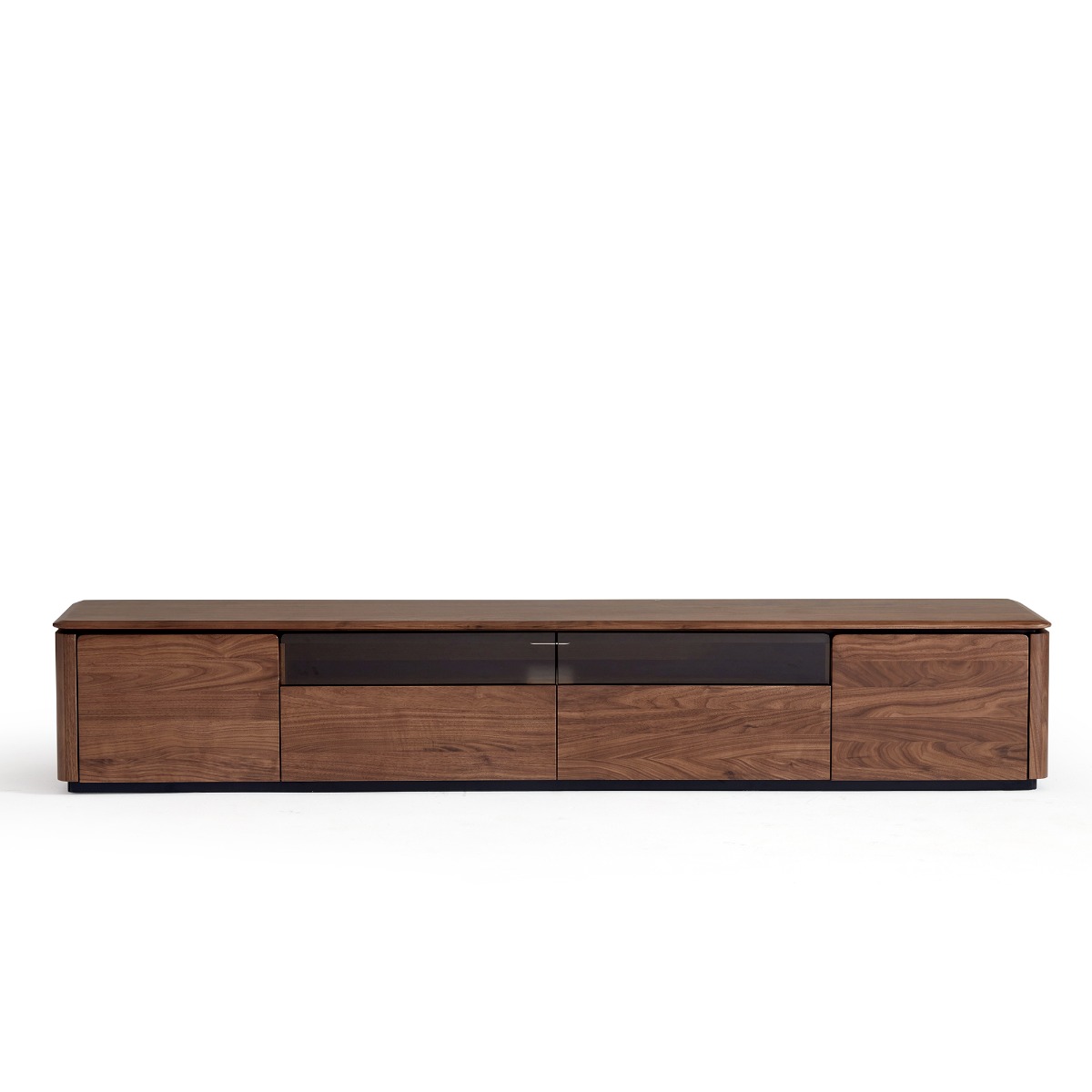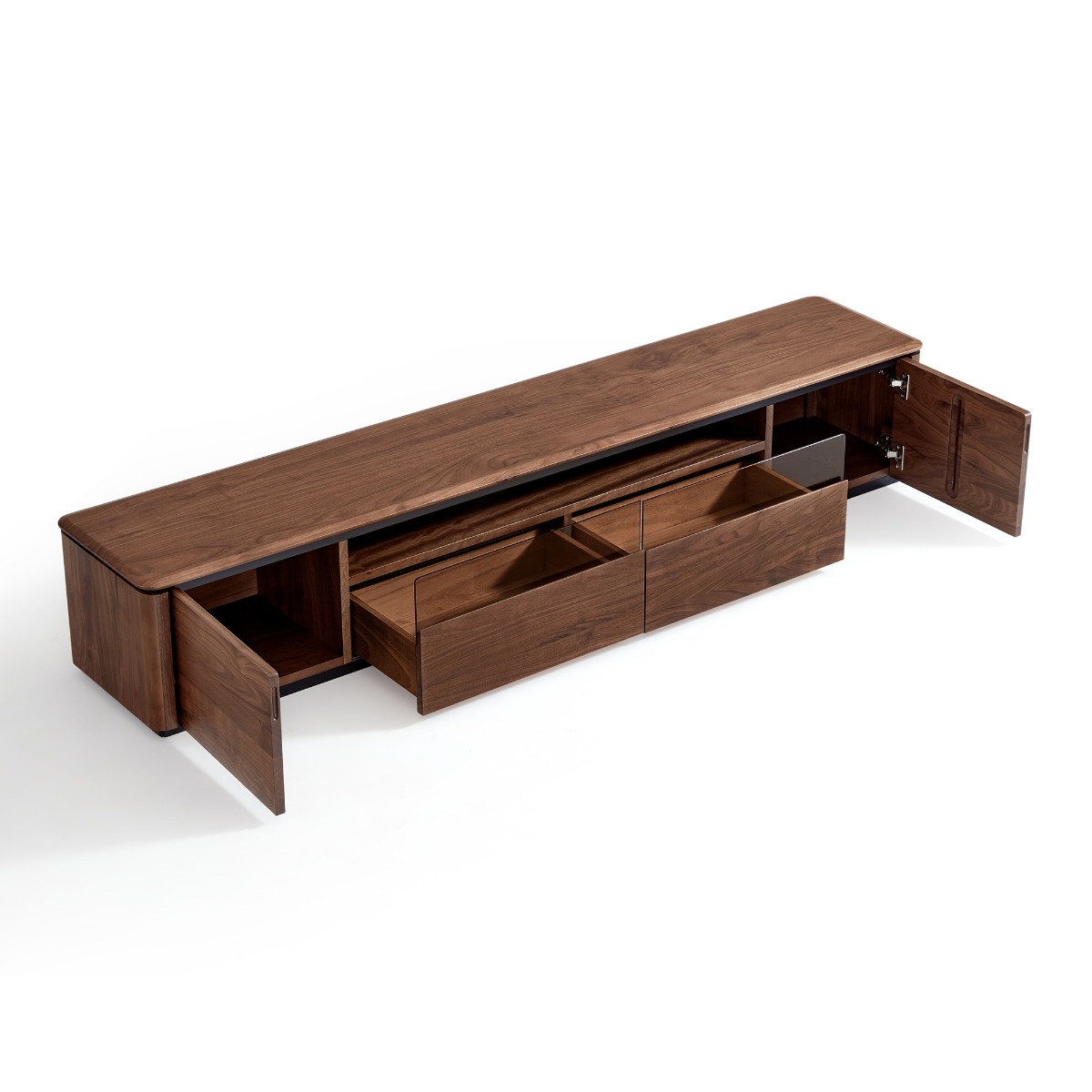 The Katica Walnut TV Console is crafted from premium North American Solid Black Walnut Wood, celebrated for its natural grain and durability. Designed for both style and function, it includes two drawers and two cabinets for dust-free storage, plus a cable management hole to keep wires tidy.