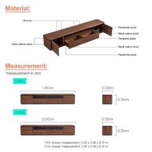 Available in two sizes—180 cm and 200 cm wide—the console supports up to 32 kg (1.8m) or 36 kg (2.0m) on the tabletop, with each drawer and cabinet holding up to 5 kg. Made from kiln-dried Paulownia and Walnut wood with tempered glass accents, it combines quality materials with elegant design.