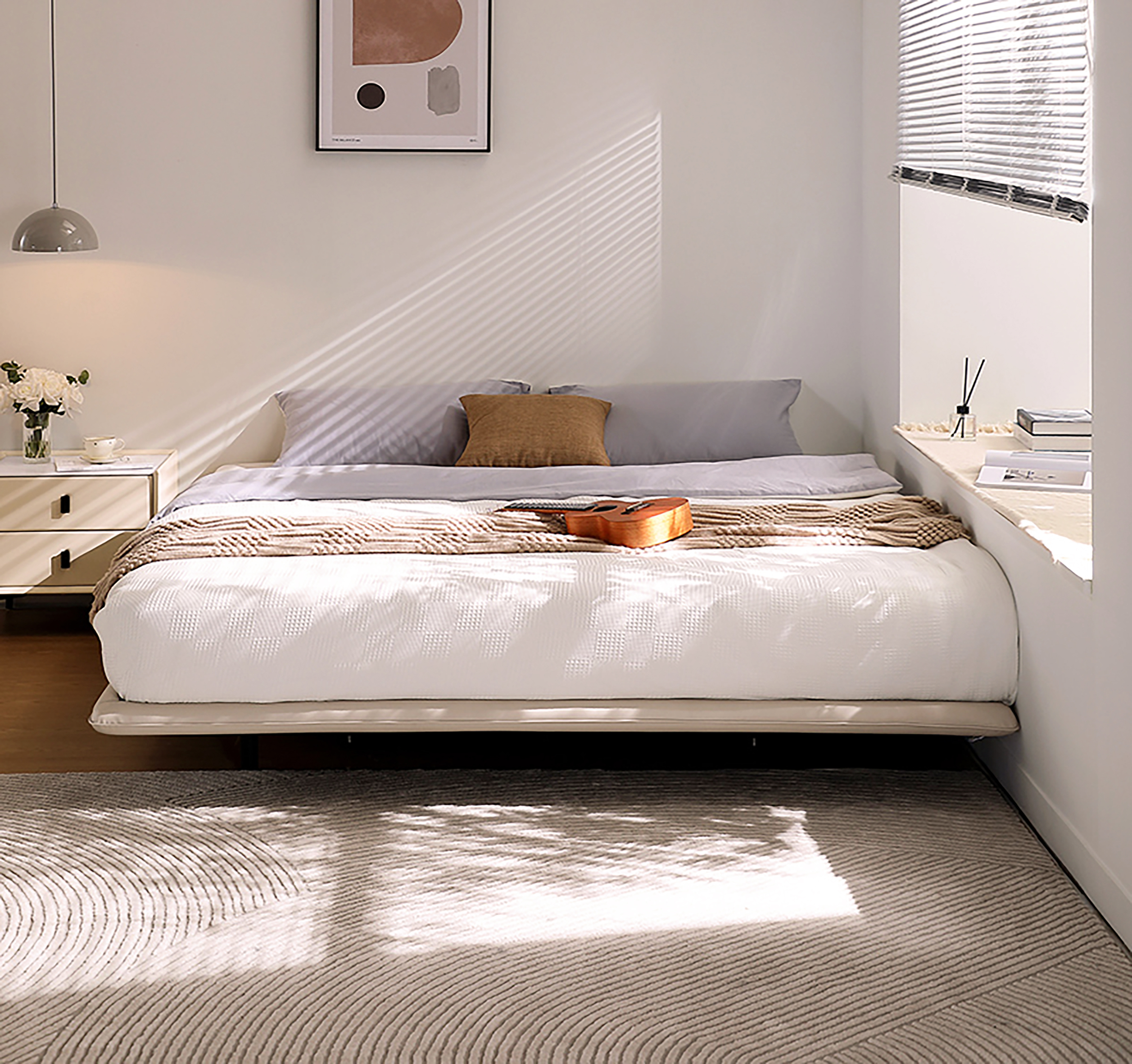 The Lawton Faux Leather Divan Bed Frame features a sleek minimalist design with medium foam-padded sides and a sturdy slatted base. Upholstered in elegant greige, it includes two free matching pedestals for added functionality. Available in Queen and King sizes. Free assembly and 3-year warranty included.