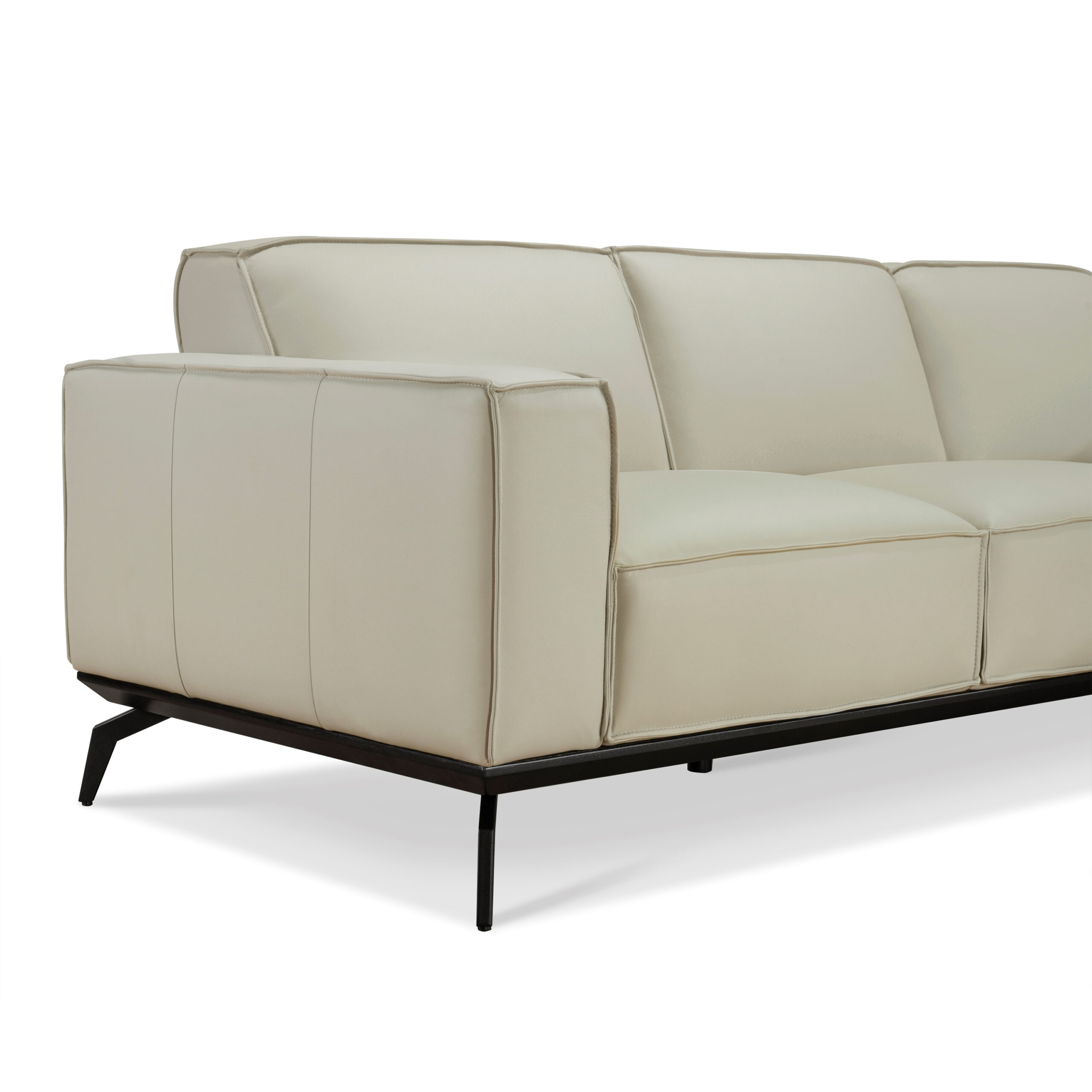 The design is completed with matte black metal legs and a black-stained solid rubberwood base, giving it a sleek, contemporary edge. Both seat and back cushions are non-removable, preserving a clean-lined silhouette.