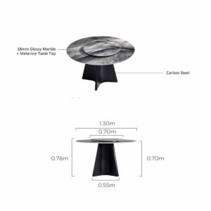 The Reinoud 1.3M Marble Dining Table is a refined blend of modern elegance and function. Its 11mm glossy cultured marble top adds a luxurious touch while resisting scratches and offering easy maintenance. The sculptural carbon steel base ensures durability and style.