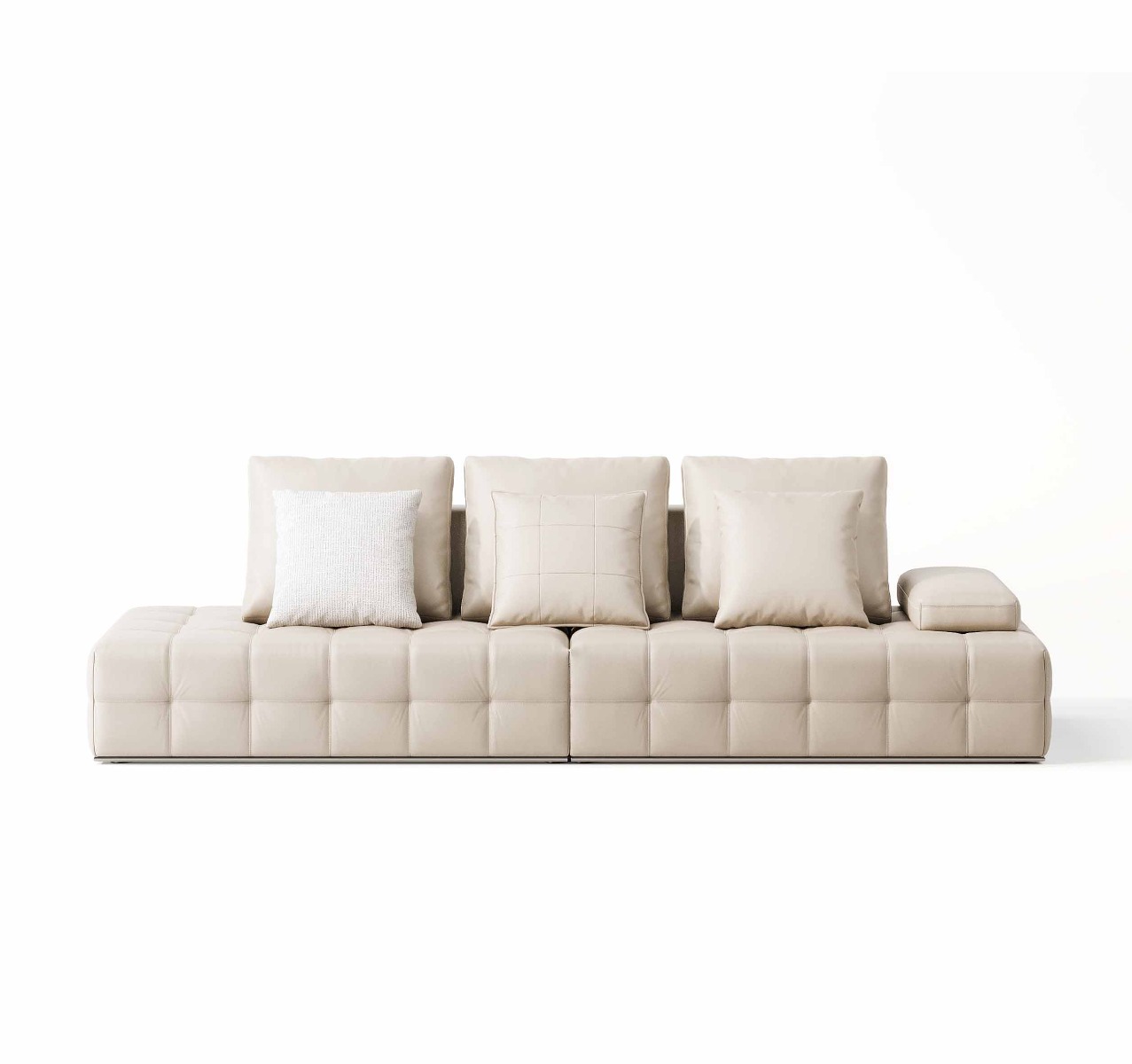 Designed with flexibility in mind, the backrests are removable, while the stainless steel base ensures long-term stability. With its neutral cream color, plush contours, and thoughtful details, the Rheinallt is a versatile choice for living rooms, lounges, or office spaces.