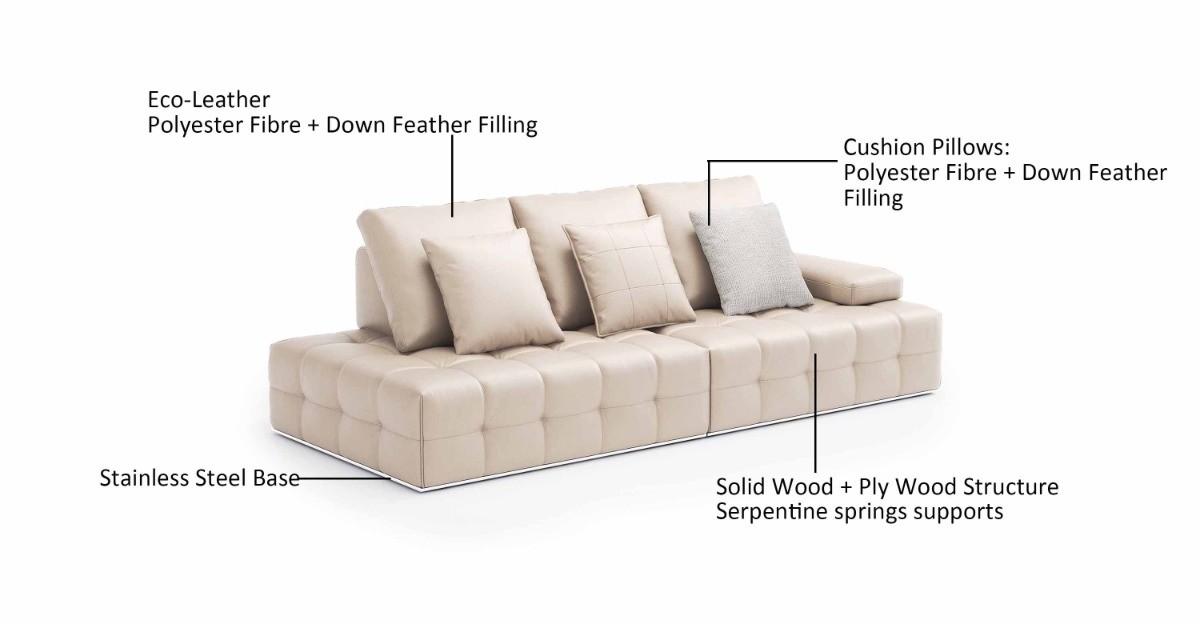 This spacious sofa is built with a solid wood and plywood frame, supported by durable serpentine springs for lasting structure and comfort. The seat and back cushions are generously filled with down feathers and polyester fiber, offering a medium-soft feel ideal for relaxing, hosting, or long lounging hours.