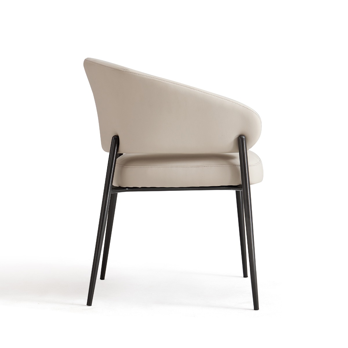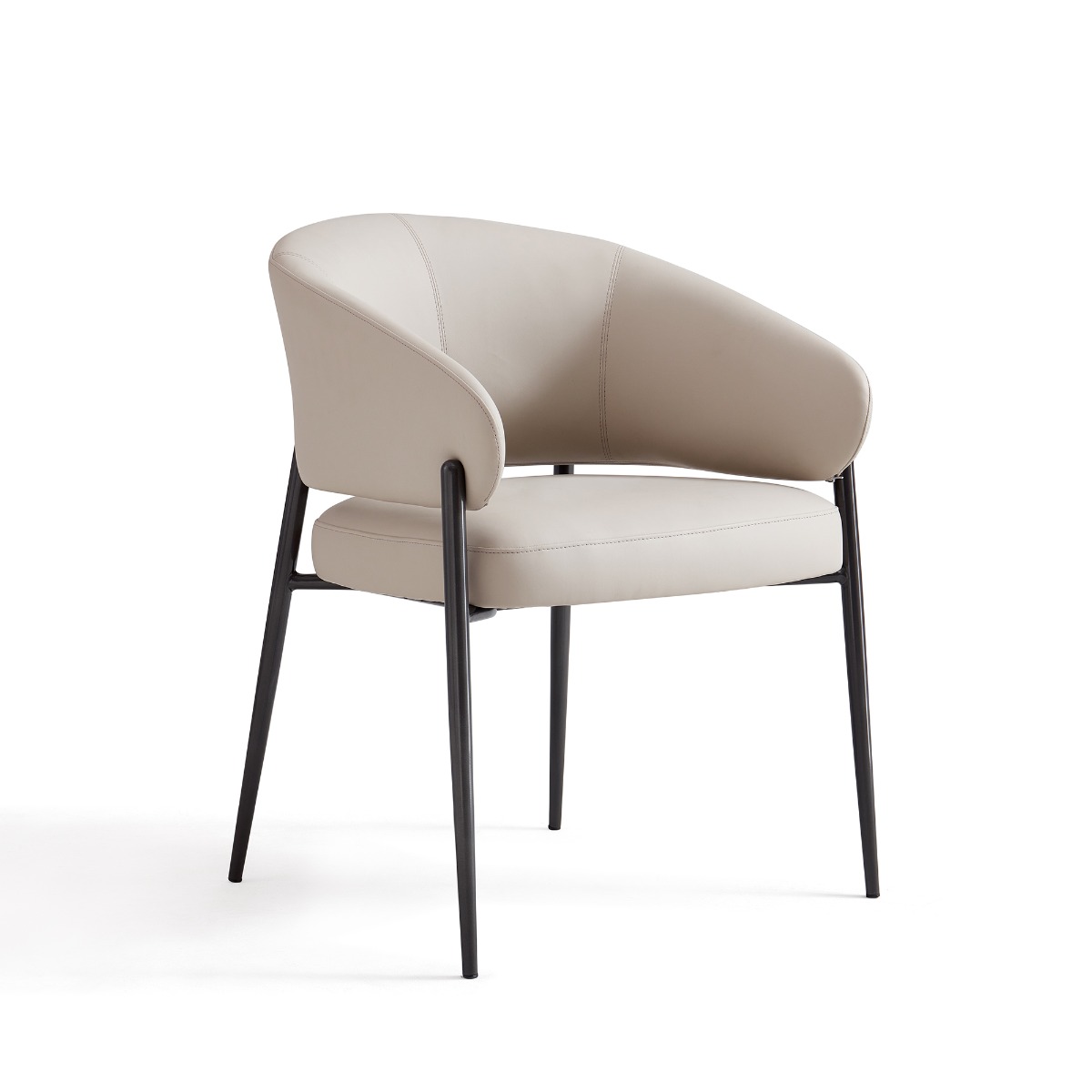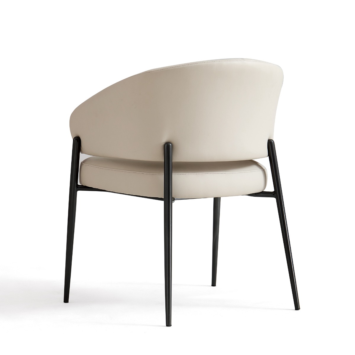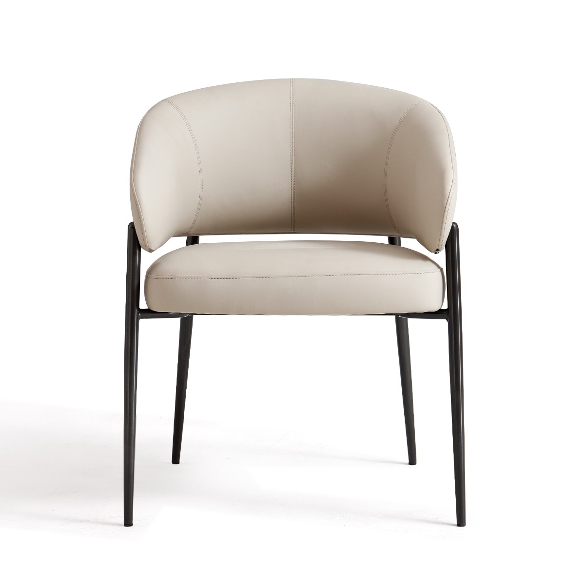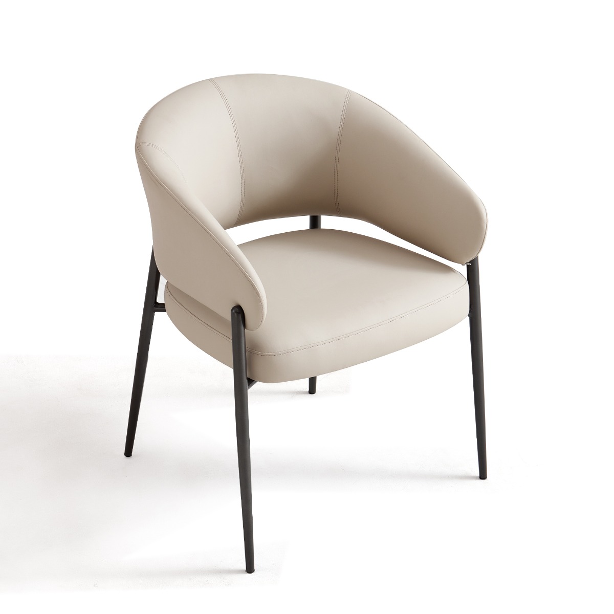 Modern faux leather dining chair with ergonomic foam cushioning, curved backrest, and sturdy iron legs. Light grey finish with free assembly included.