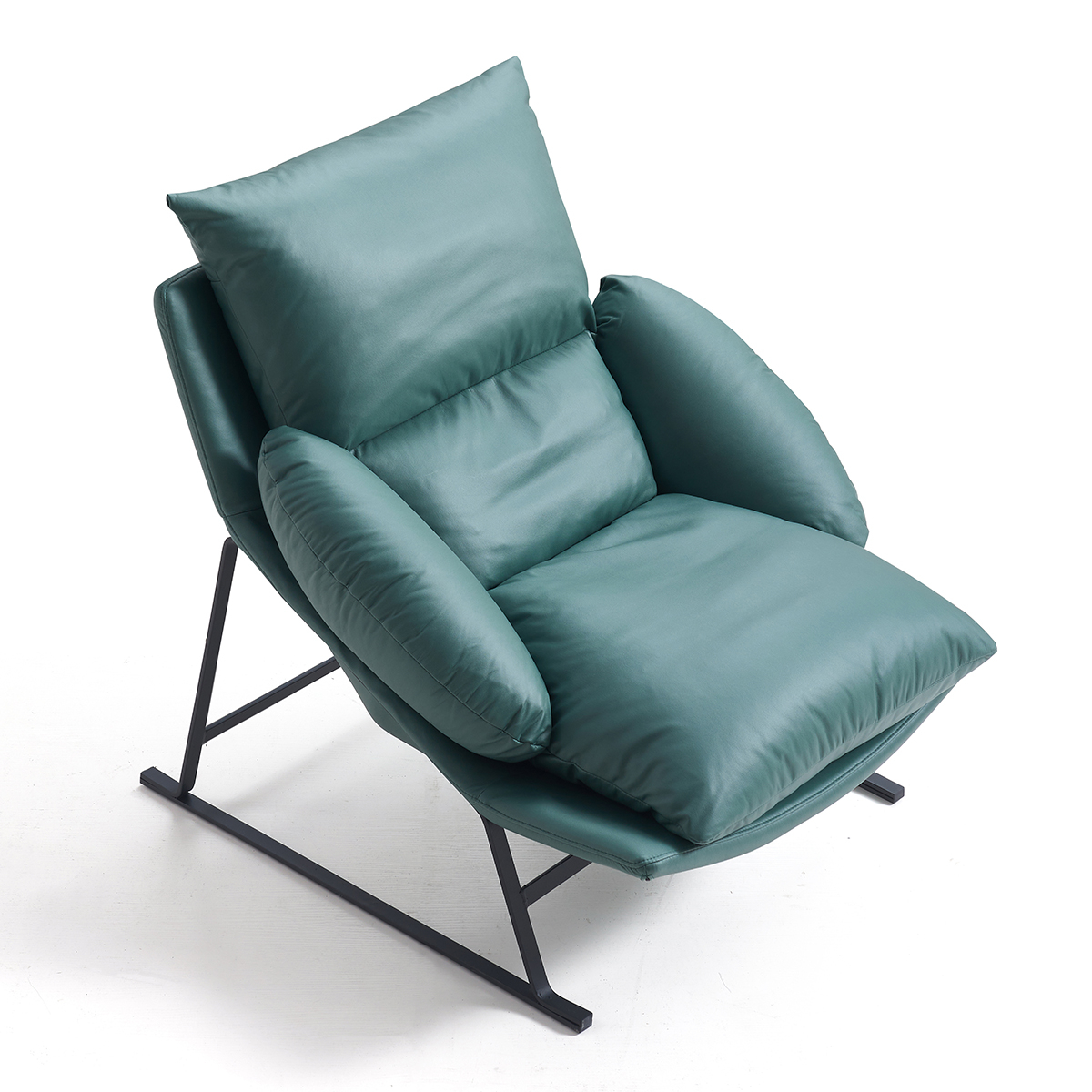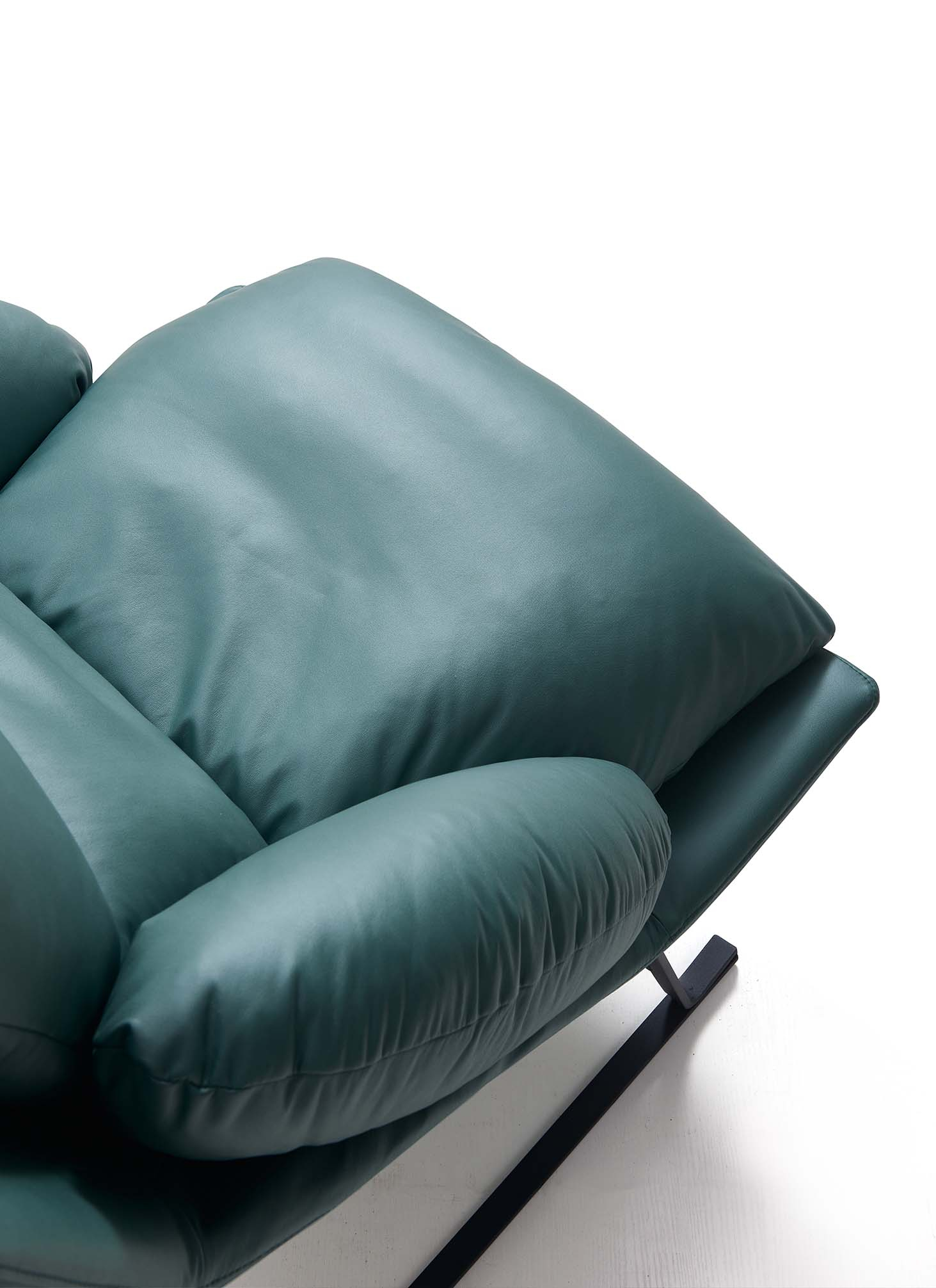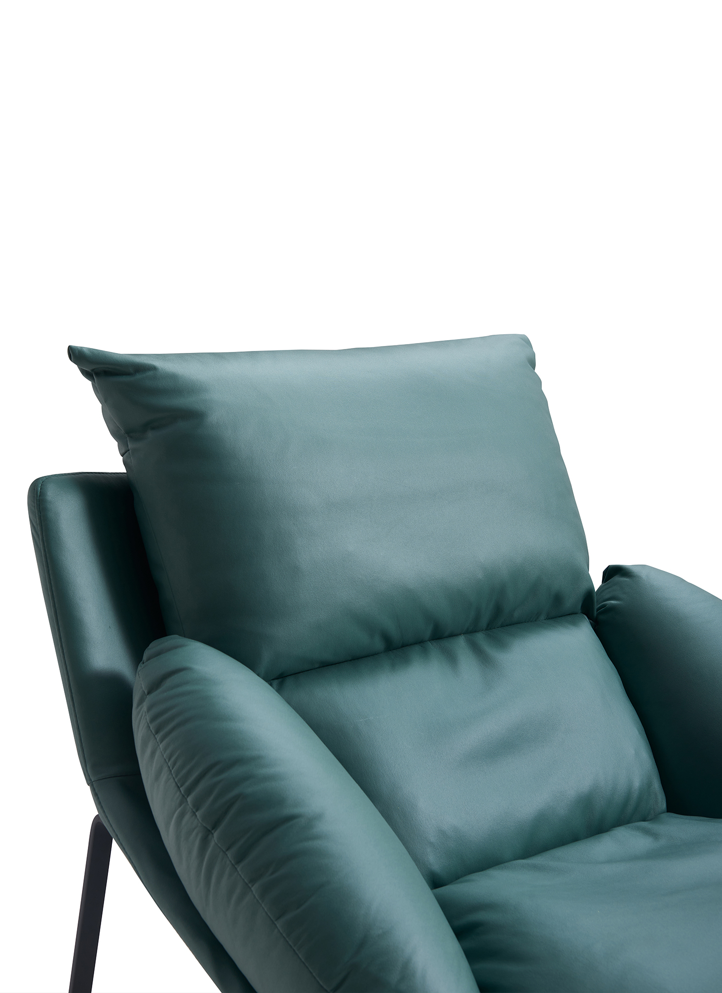 Upholstered in Leathaire, a breathable synthetic material that mimics leather, the chair stays cool, is moisture-proof, scratch-resistant, and easy to maintain. Its down-feather and polyester fibre filling provides a soft, cosy seat with medium firmness — perfect for relaxed lounging.