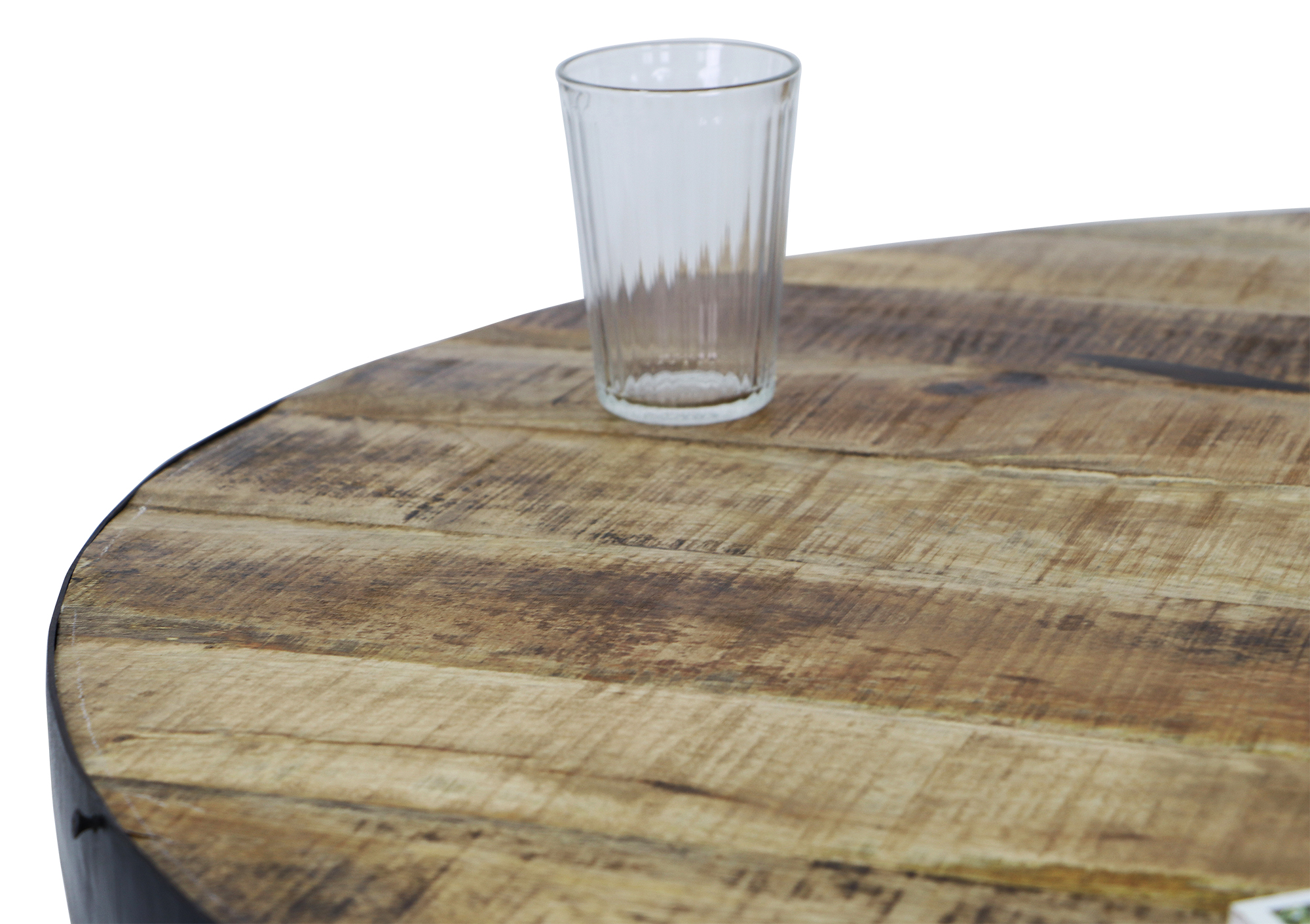 The Yeng Coffee Table brings rustic industrial charm to your living space with its round drum shape and bold, handcrafted design. Made in India from reclaimed solid mango wood and galvanised metal, each piece is one of a kind with natural imperfections in wood grain, finish, and texture. The table’s surface is hand-finished and sealed with a protective lacquer, while the metal base adds strength and vintage character.
